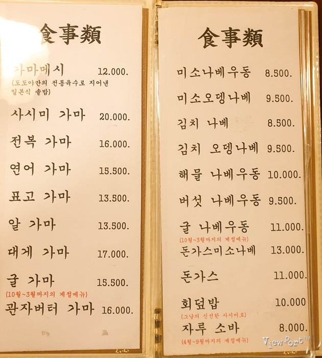 메뉴판을 받아보면 주로 솥밥인 가마 메시 (가마)류와 나베,