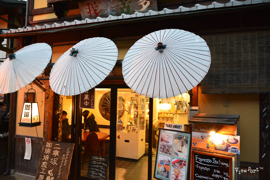 일본식 고유 우산이 걸려 있는 가게는 가배, 커피 가게네요.