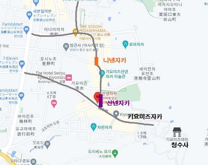 간단히 구글지도에서 일부 약도를 만들어 봤습니다. 버스정류장에서 청수사까지 올라가는 길인 키요미즈자카와 산넨자카 니넨자카가 연결되는데요, 니넨자카나 산넨자카는 경사가 매우 가파르기때문에, 키요미즈자카를 통해 기요미즈데라를 구경하시고, 내려오는 길에 산넨자카 니넨자카를 보고 내려 오시면 됩니다.