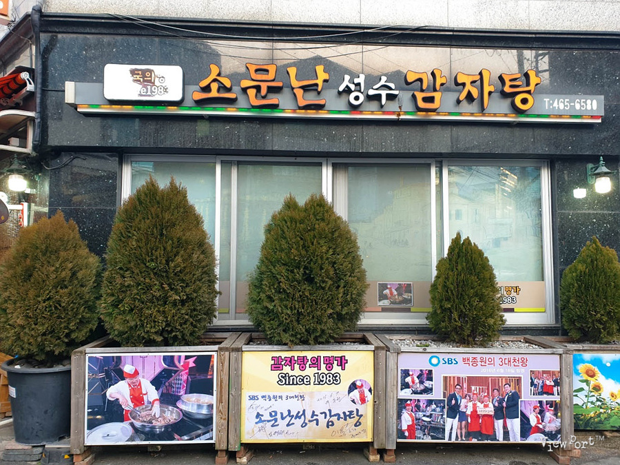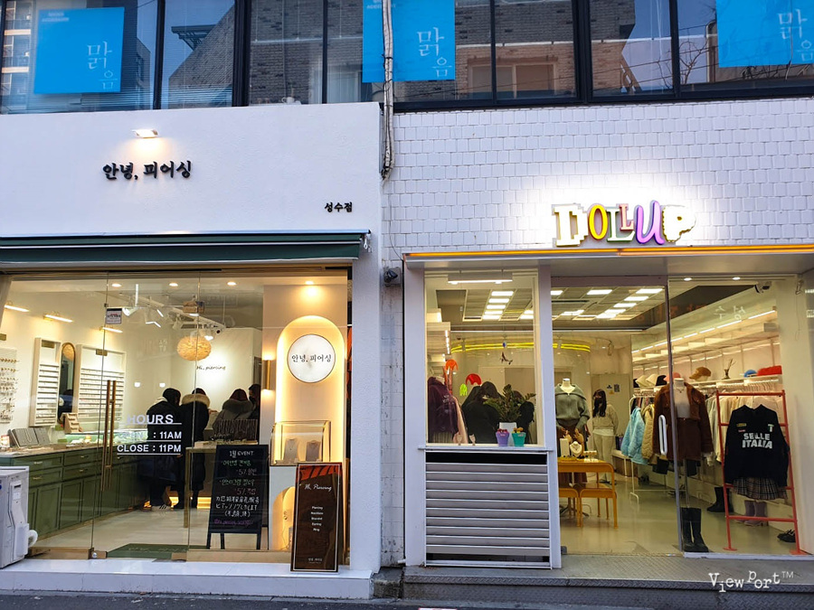 길 모퉁이에는 안녕,피어싱가게와 작은 옷가게가 있고, 건너편에는 SBS 백종원의 삼대천왕에 나왔다는 이 구역의 맛집인 소문난 성수 감자탕집이 있어요