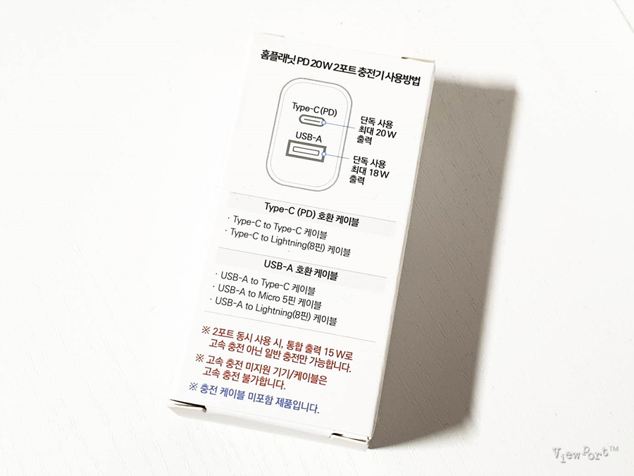 위 그림을 보면 USB A 타입과 C타입을 모두 지원하는 2포트 어댑터인데요, USB A타입은 최대 18W, C타입은 20W가 출력됩니다. 출력이 높을수록 당연히 고속충전이 이뤄지죠.
