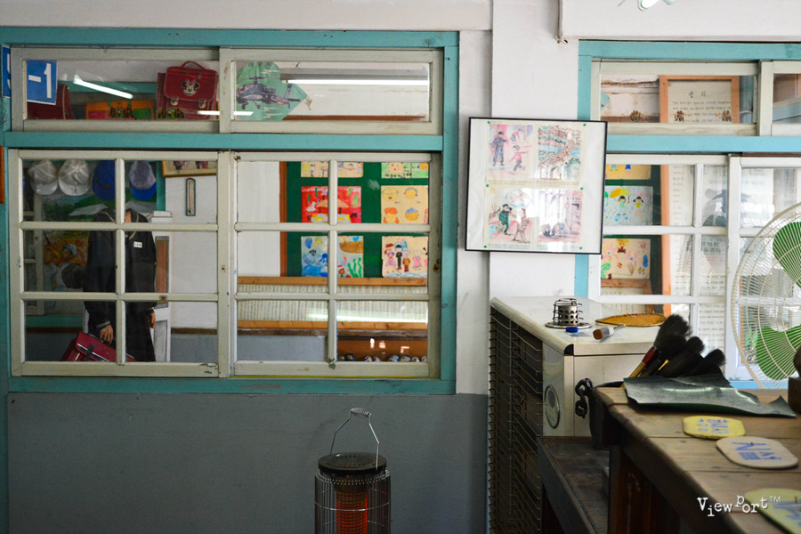 입구에 실내화들도 보이고, 교실 가운데 난로와 그 위에 쌓아 놓은 양철 도시락도 보입니다