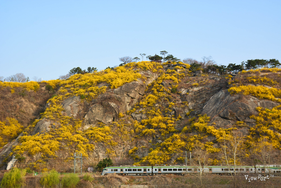 응봉산 개나라숲의 또 다른 낭만적인 모습은, 개나리꽃을 배경으로 달리는 열차의 모습이죠