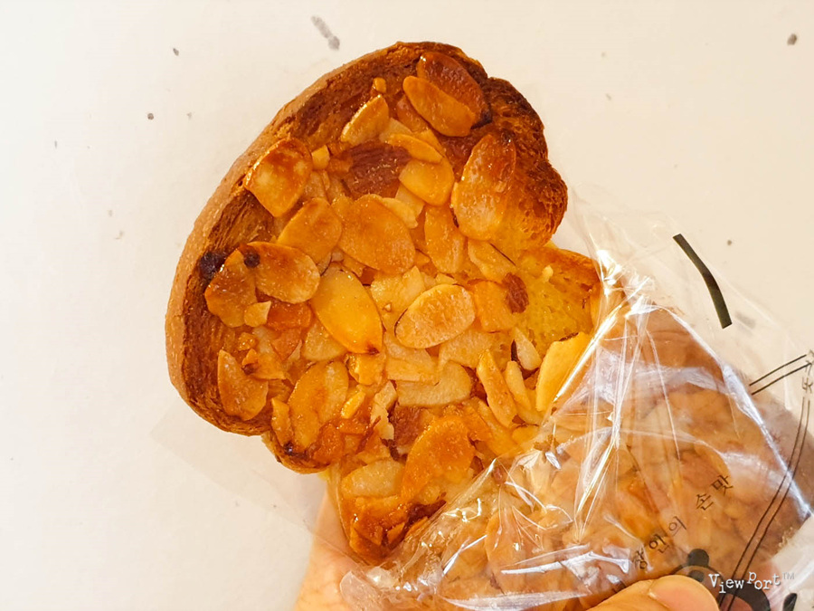 뭐 부터 먹을까 하다, 일단 커피와 가장 잘 맞고 익숙할 것 같은 꿀아몬드빵을 집었습니다