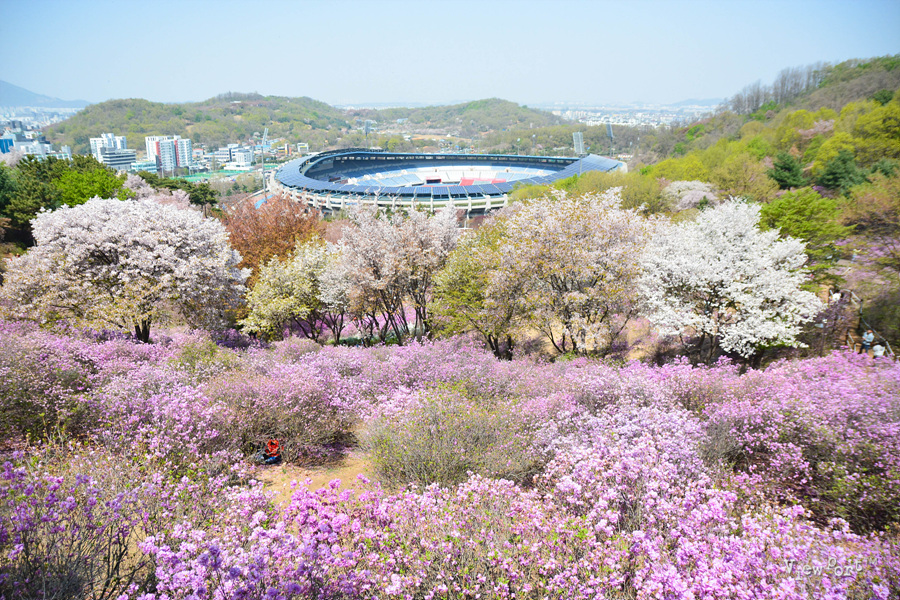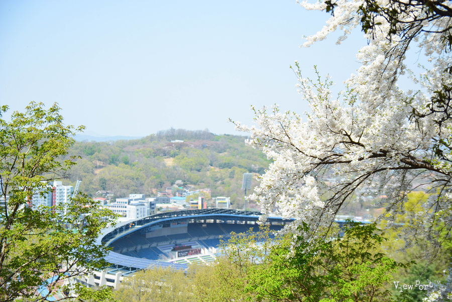 정상에 오르면 저 아래 종합운동장을 배경으로 하는 진달래 동산 공식 인증샷을 담을 수 있었어요