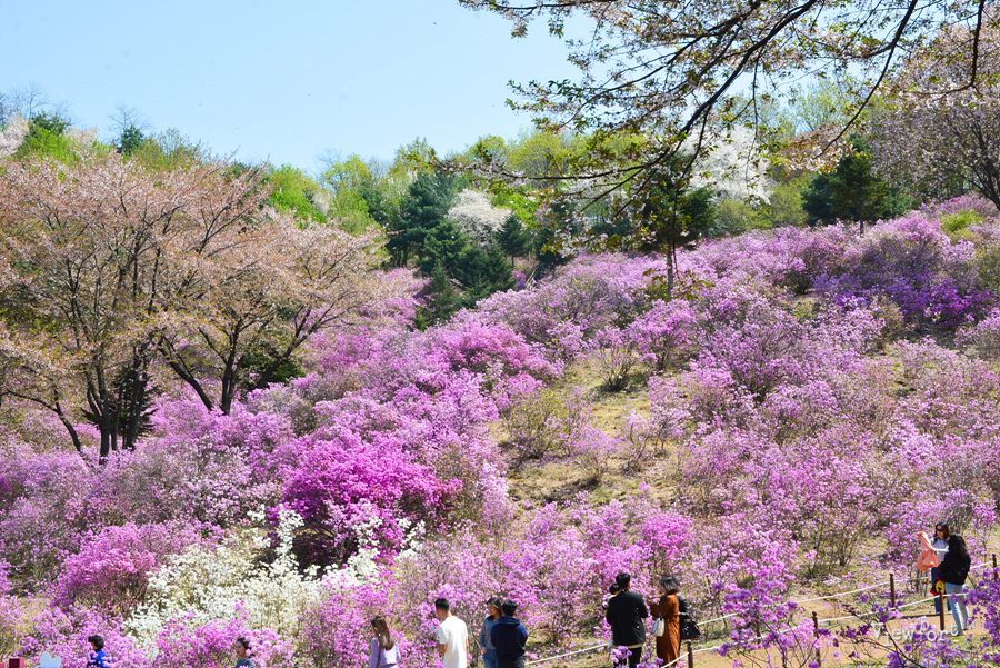 원래 진달래 축제가 벚꽃 축제보다는 먼저인데, 지난 주에 비가 오고 바람이 불면서 진달래보다는 벚꽃들이 먼저 끝나버렸습니다. 진달래는 아무래도 산자락에 있다보니 높은 지대에는 좀 늦게 피기도 하고, 벚꽃처럼 쉽게 꽃들이 떨어지지 않으니까, 아직 남아 있을 거란 기대를 갖고 갔습니다