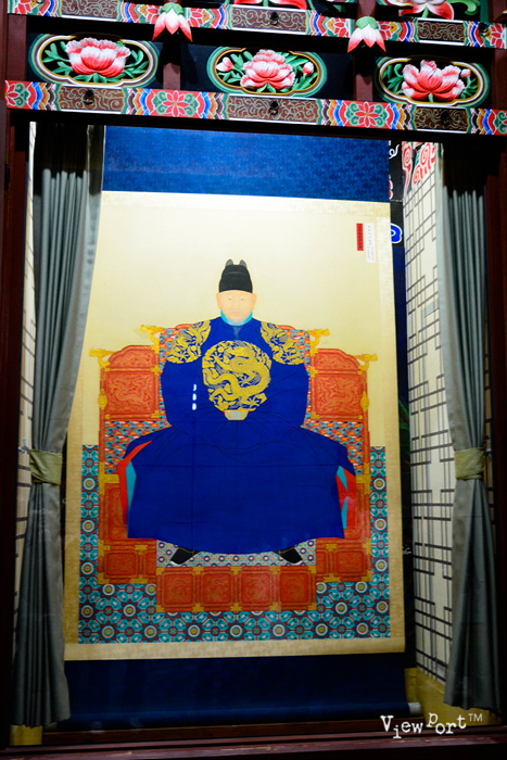 가슴과 어깨에는 황을 상징하는 다섯 발톱을 가진 용이 그려 있고, 어진은 비단의 뒷면에 색을 칠해서 색감이 앞으로 베어 나오게 하는 배채법으로 그려서 색감이 은은하고 깊은 것이 특징입니다