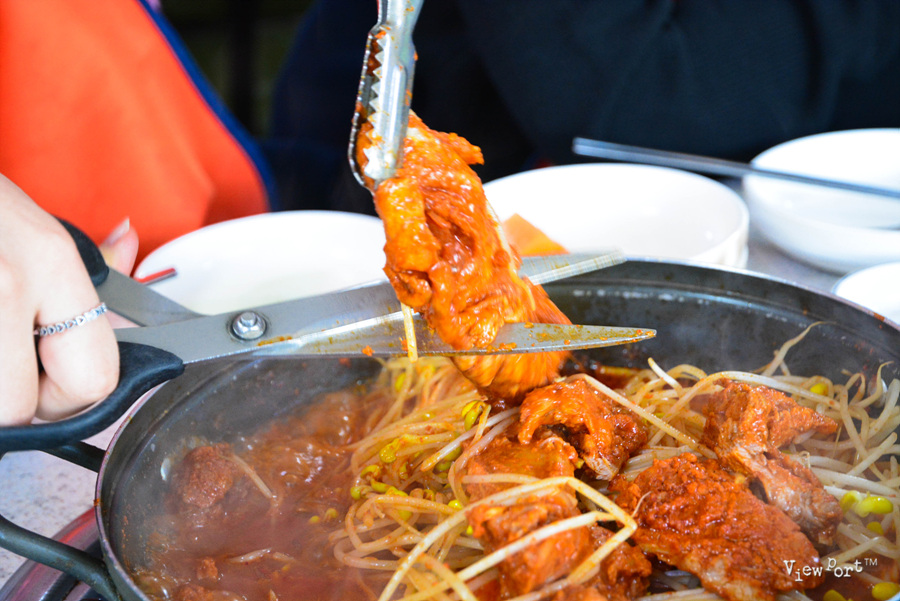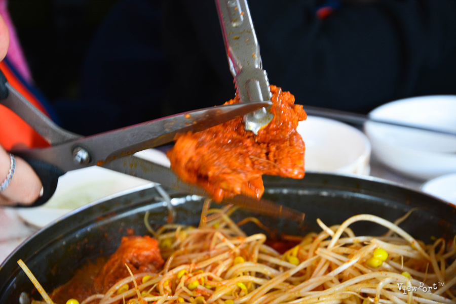 금새 10분이 지나서, 맛있게 먹는 방법대로 콩나물 아래에 숨어있는 갈비들을 먼저 먹기 좋게 자르고 있습니다.