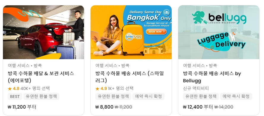 미리 예약을 해 놨으면 좋을텐데, 마지막 날 아침 결정을 하게되서, 부랴부랴 클룩에 들어가서 수화물 배송 서비스를 알아봤는데, 위와 같이 에어포텔, 벨럭, 스마일러그 세가지가 나옵니다.