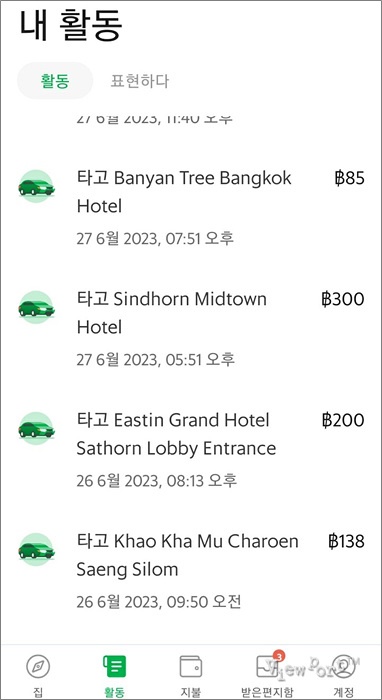 방콕에서 그랩을 사용한 이력을 볼 수 있는데요, 많이 나온때는 뒤에 보시겠지만 공항까지 360B (고속도로이용료 포함), 적게 나올때는 85B 나온 것도 있더라구요. 1B = 약 38원 생각하면 우리나라 택시비에 비하면 많이 저렴하죠
