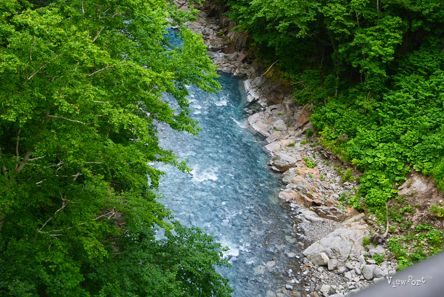 다리 아래로 흐르는 비에이강의 모습을 볼 수 있는데, 강물의 색이 마치 소다아이스바와 같은 푸른 빛을 띄고 있습니다.