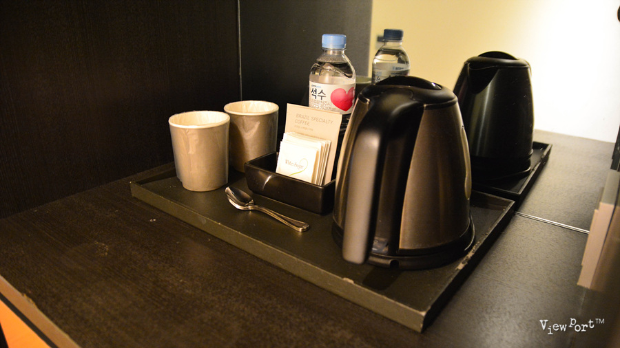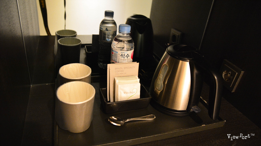 차대에는 전기포트와 생수 한병이 있고, 여기도 일회용 컵이 제공되고 있네요.