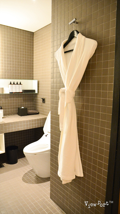 헤어 드라이어와 일회용 칫솔이 제공되고, 욕실 앞에 가운이 걸려 있네요