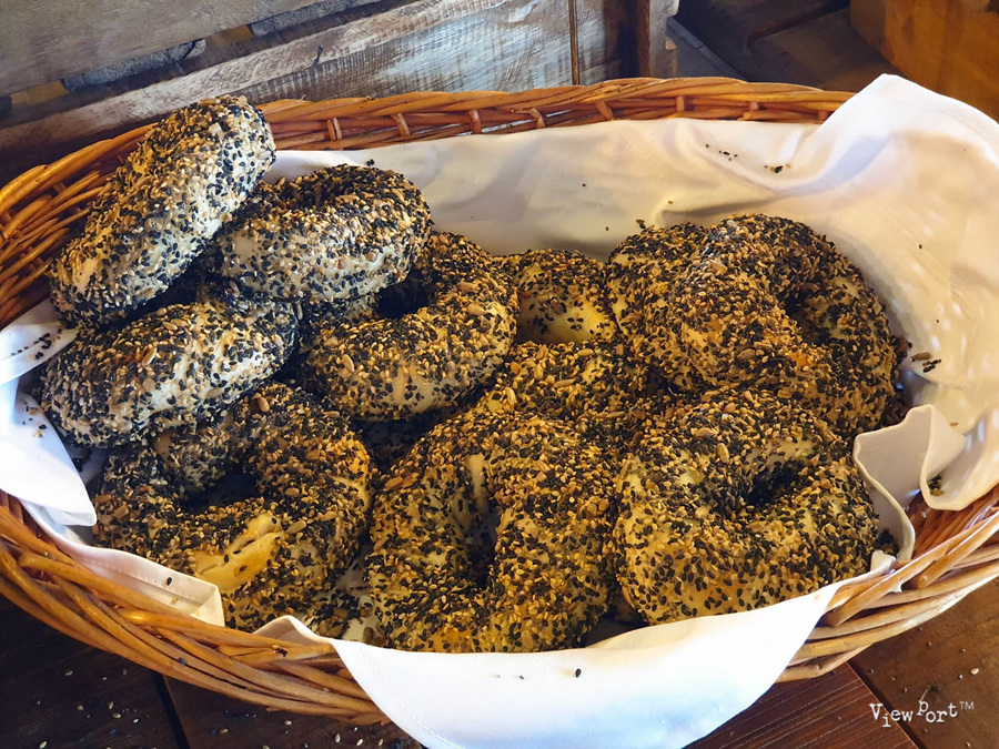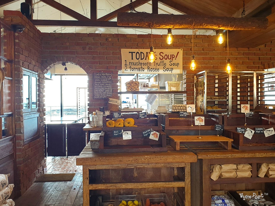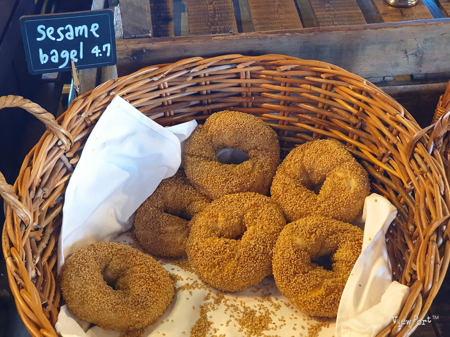 베이글과 커피등 음료등을 구입하고 아래층에 내려가면 바다 전망이 있는 식당공간이 있어서 여기서 먹고 갈 수 있습니다.