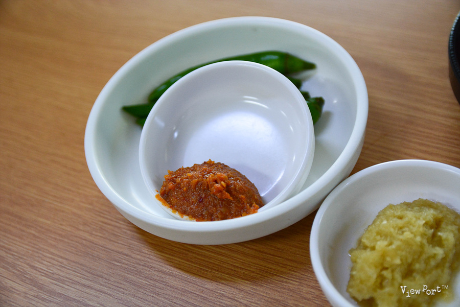 밑반찬으로는 깍두기, 김치, 고추와 된장, 다진 마늘이 나왔네요.