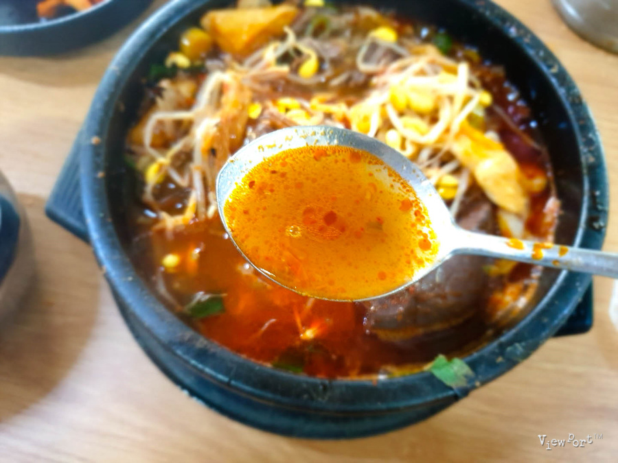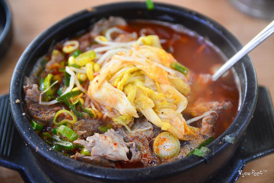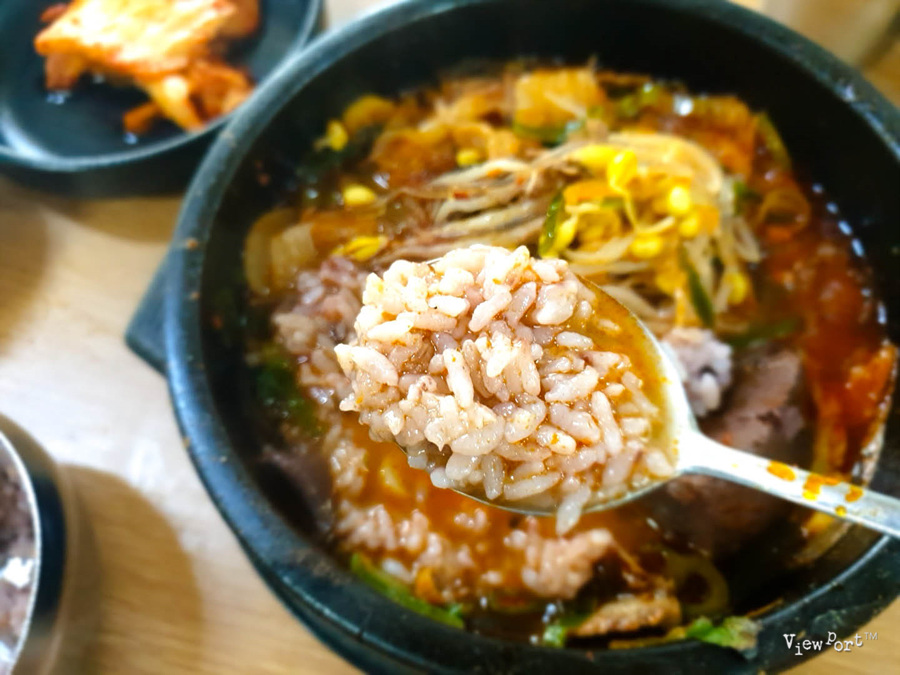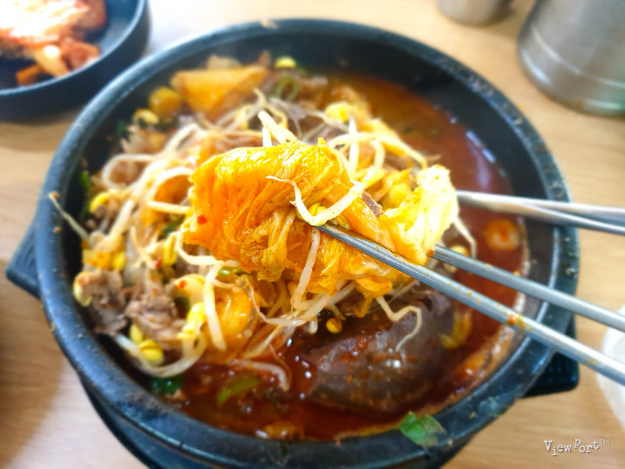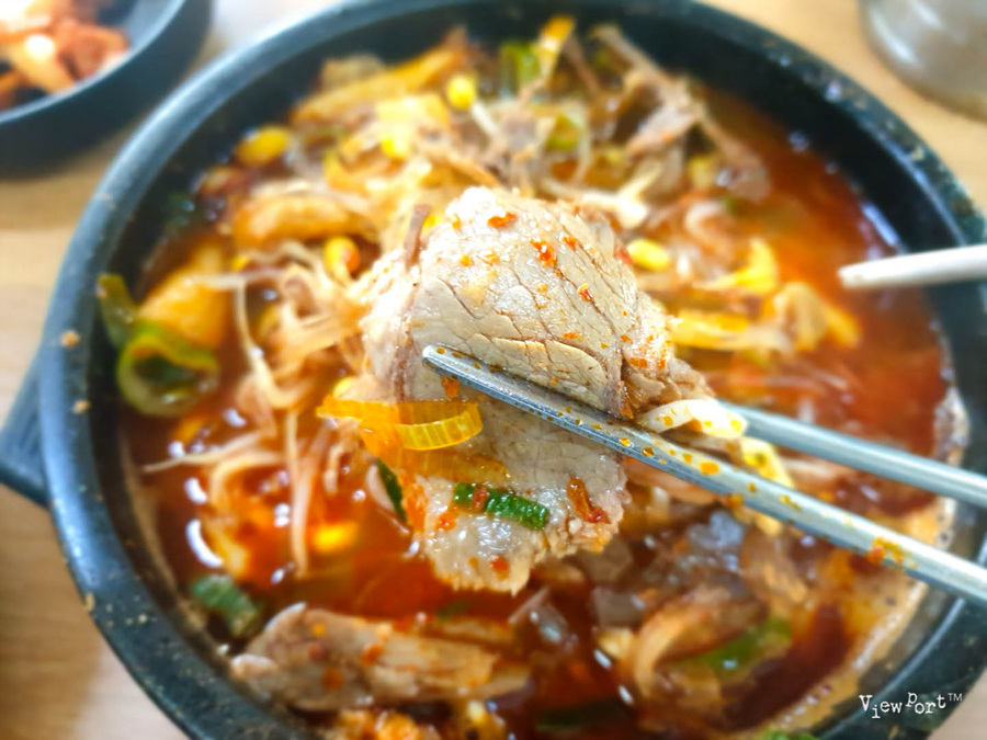 콩나물이 들어가 있어 시원한 맛이 더해지고, 고기는 기름기가 없는 부위여서 담백합니다
