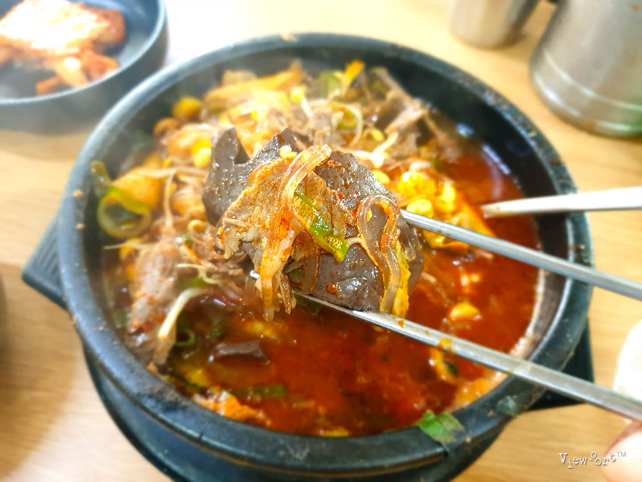 은희네 소고기해장국은 배추우거지와 선지, 그리고 소고기를 넣고 끓여냈는데, 기름기가 없고 담백한 맛이 특징입니다.