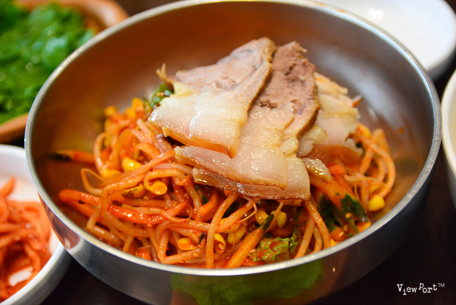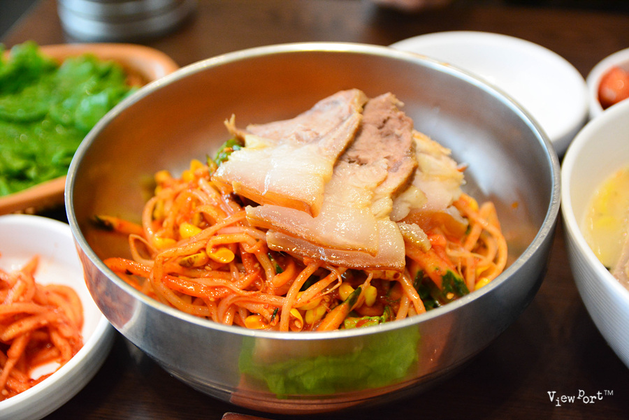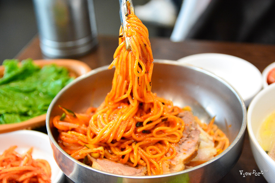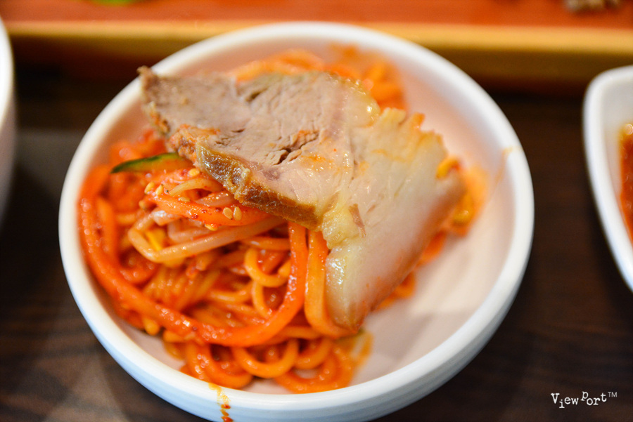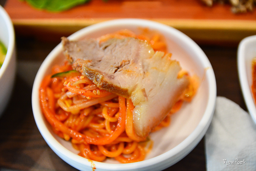 그리고 여기에 고기 한 점을 얹으면 쫀득쫀득한 고기와 매콤새콤한 면이 어울려 아주 환상적인 기억을 남게하죠