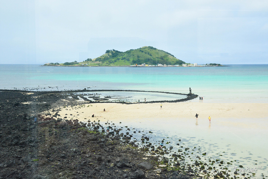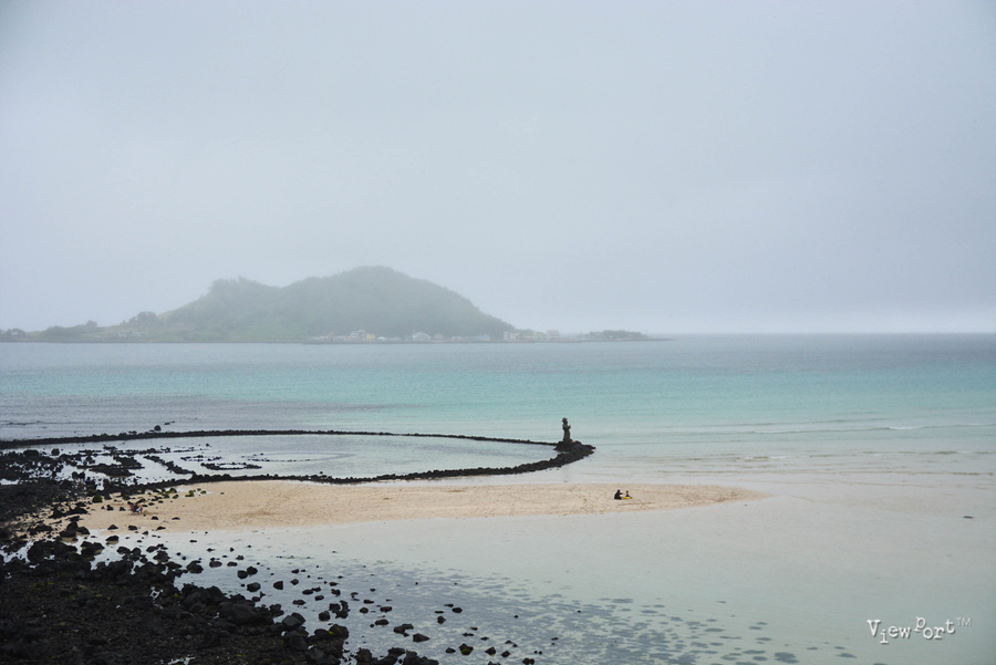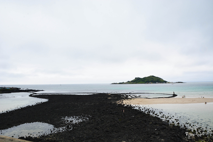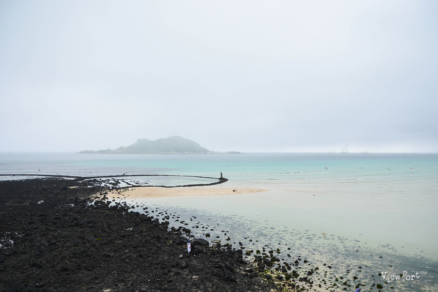 멋진 비양도를 배경으로, 해수욕장 옆을 보면 돌로 쌓아놓은 담이 보입니다.