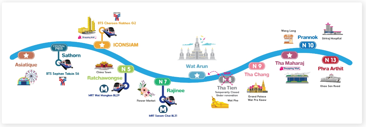 짜오프라야강 수상버스가 다니는 곳들중에 우리가 갈만한 여행지들을 정리하면 아래와 같습니다.
