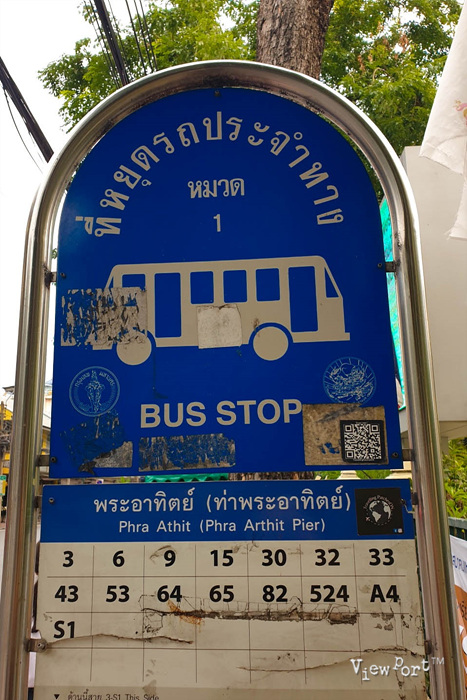 위는 카오산로드로 들어가는 수상버스 정류장인 쁘라아티트피어 앞 버스정류장인데요, 보시는 것처럼 운행하는 버스 번호와 주요 노선이 프린트되어 있읍니다.