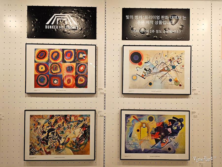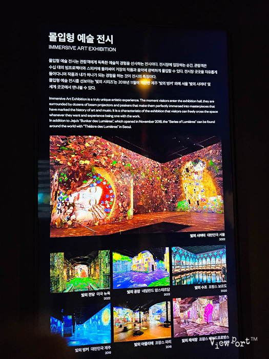 일반 전시와 다른 점은 일반 전시는 평면적인 공간인 벽에 그림들이 부착되어 있는 반면에, 빛의 벙커에서는 넓은 전시 공간의 모든 벽면과 바닥에 이와 같이 그림들이 조사되고 있어, 보다 더 입체적이고 마치 그림속에 들어와 있는 것 같아 훨씬 몰입감이 좋습니다