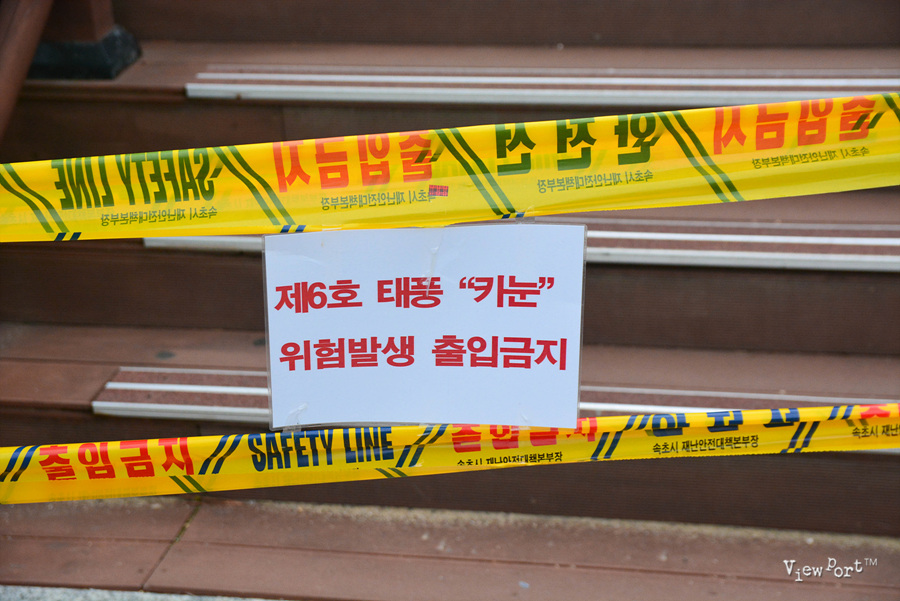 속초는 워낙 자주 가는 곳이어서 가볍게 생각했었는데, 실제로는 태풍의 영향으로 출입을 막은 곳들도 있었고, 부분만 개방한 곳들도 있었는데요, 영금정은 바닷가쪽으로 들어가 있는 해돋이정자(동명해교)쪽은 막아 놓았고, 그나마 다행히 영금정은 개방을 해 둔 상태여서 영금정에 올라봤습니다
