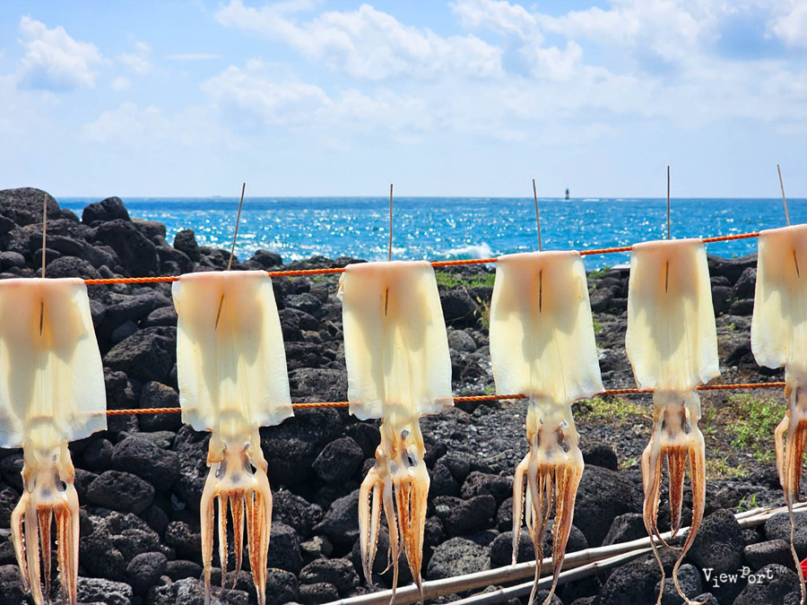가게 앞으로는 이렇게 바다가 보이고, 바람에 한치를 말리고 있는 모습을 볼 수 있읍니다