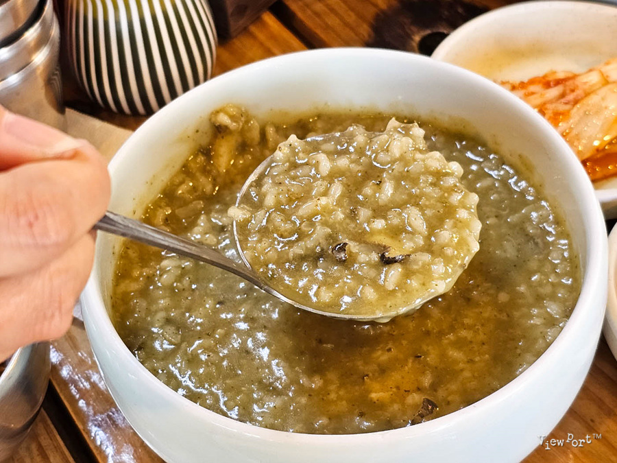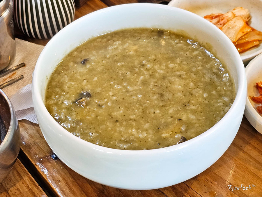 그리고 내장을 넣어 끓여 색이 파랗게 나온 전복죽...