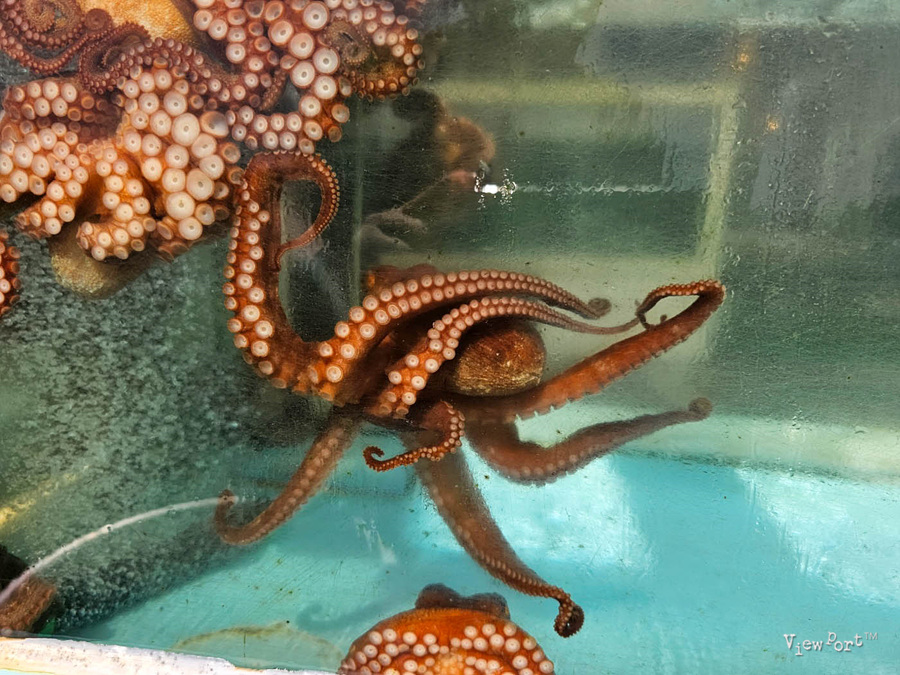 수조에는 해녀에게 잡혀 온 문어들이 창에 붙어 있군요