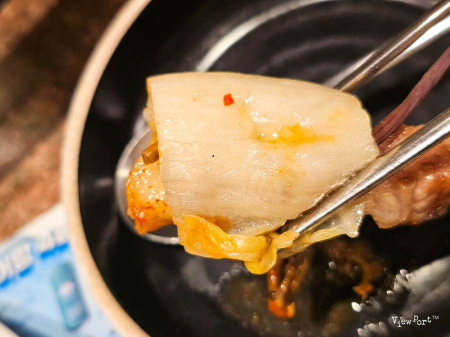 보시는 것처럼 도톰한 고기위에 장아찌들과 와사비, 명란등을 조합해서 올려 먹는 거예요