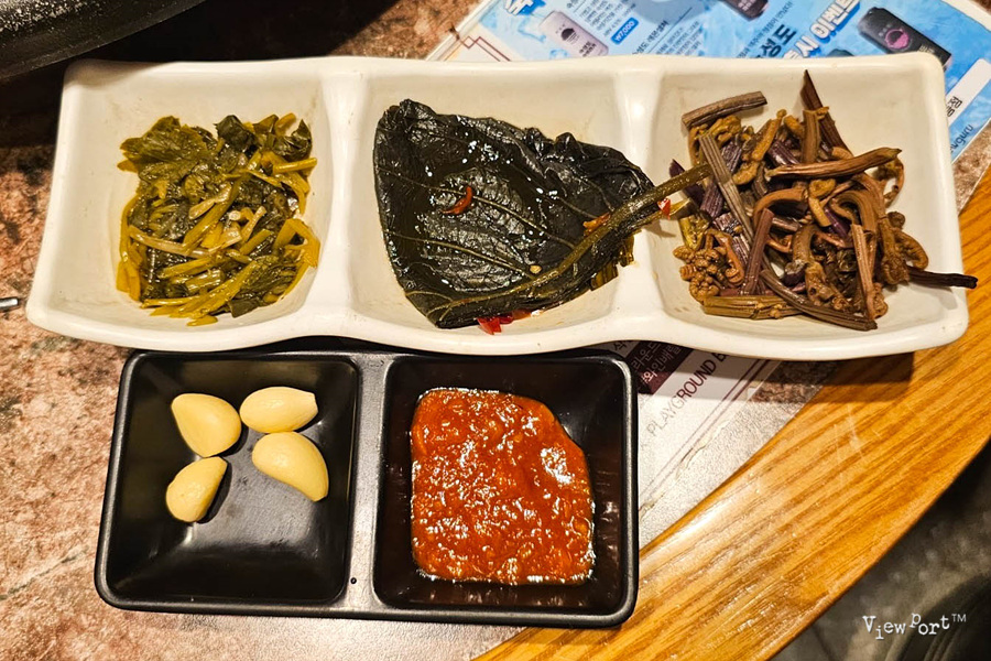 앞서 밑반찬으로 나왔던 장아찌들과 함께 숙성도 만의 고기 맛있게 먹는 법이 있어요