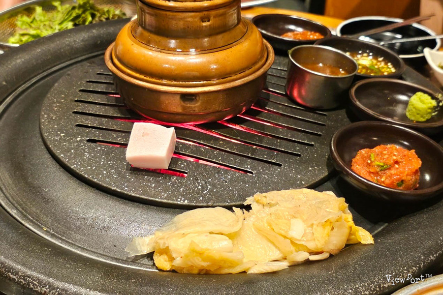 드디어 불이 올라가고, 기름 한덩이로 불판에 기름칠을 해 줍니다