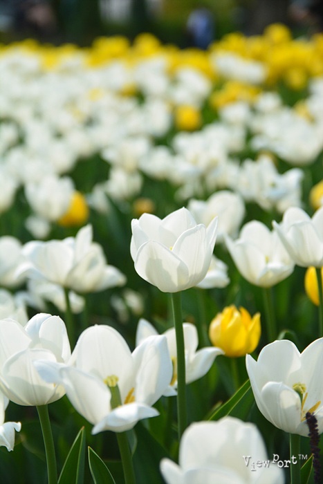 중간 중간 하얀색 튤립과 노란색 튤립이 섞여있어요