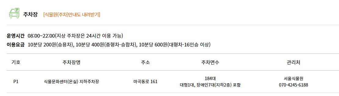 ▷ 주 소 : 서울 강서구 마곡동로 161 서울식물원 ▷ 운 영 : 연중 무휴 ▷ 대중교통 : 9호선 또는 공항철도 마곡나루역 / 5호선 마곡역에서 6642번 버스 1정거장 ▷ 주 차 : 하기 안내 참고 |