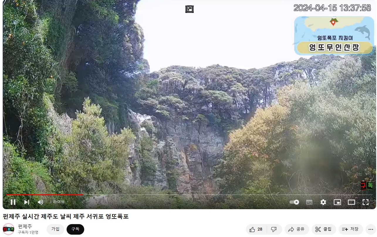유튜브에서 "펀제주" 실시간 제주도 날씨 제주 서귀포 엉또폭포를 찾으시면 되요.