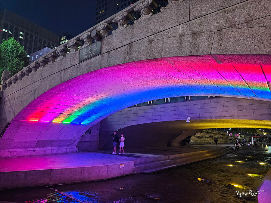 모전교에는 무지개색 조명이 비춰서