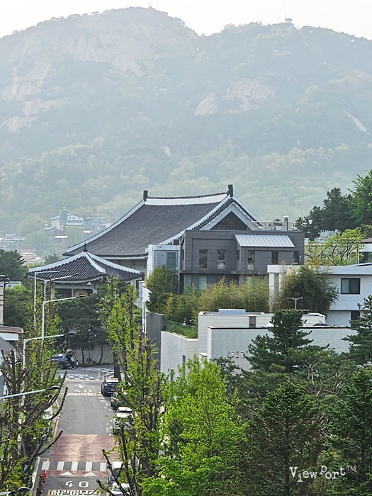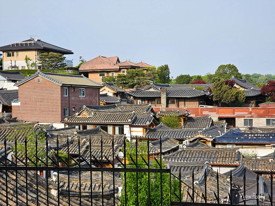 골목길을 조금 더 들어가면 이렇게 북촌로 일대를 한눈에 볼 수있고 여러 한옥들의 기와 지붕을 볼 수 있는 곳인데요, 골목도 좁고 사람들도 많이 찾는 곳은 아니어서, 힘드시면 바로 5경으로 가셔도 괜찮을 것 같습니다
