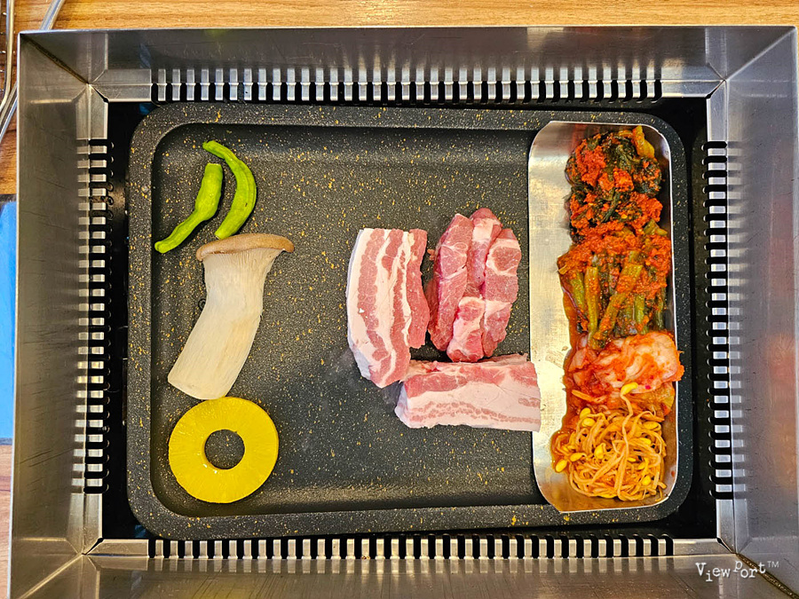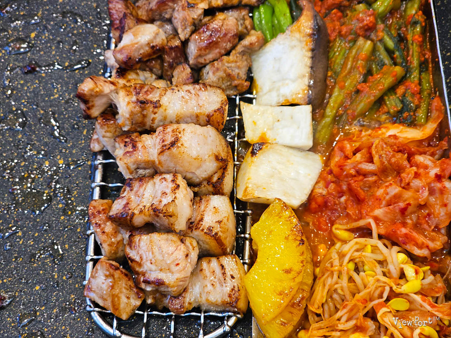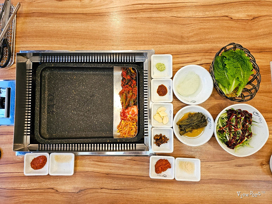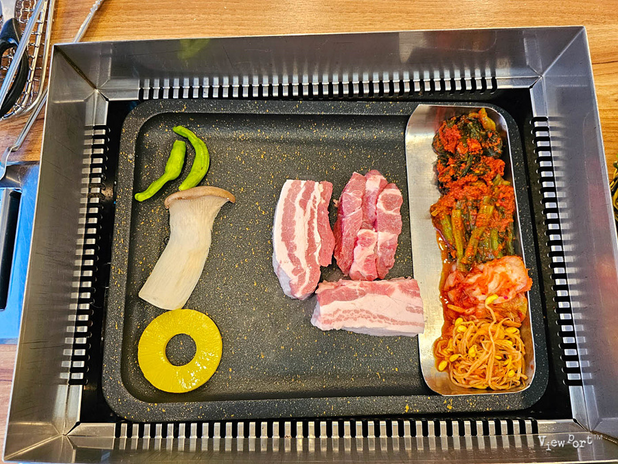 아래쪽으로 경사가 있어서, 고기를 굽는 기름이 내려가는데, 여기에 김치, 갓김치, 콩나물을 굽게 만들었더라구요