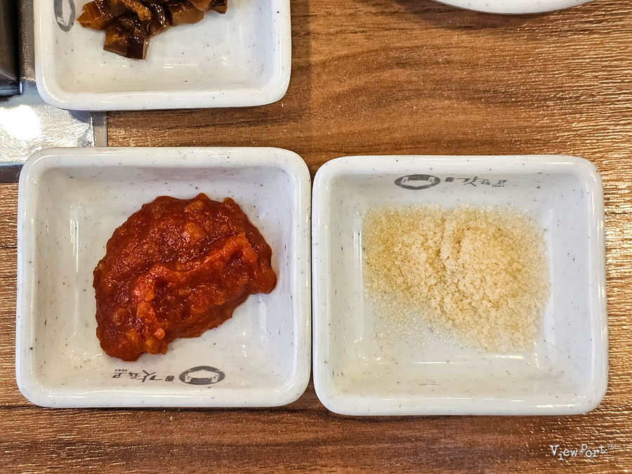된장과 소금외에 파채, 쌈, 무쌈, 갓절임, 표고버섯장, 와사비,토하젓이 나옵니다