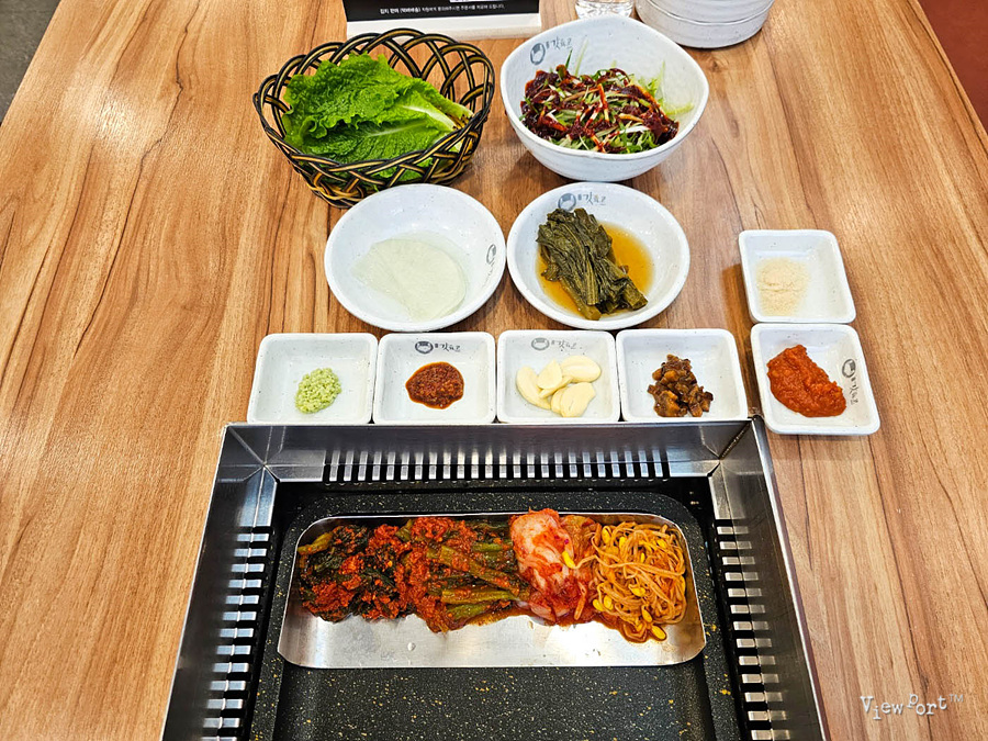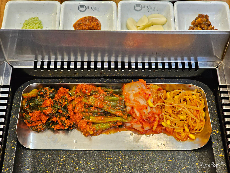 역시 불판 아래 철판 기구위에 갓김치와 김치, 콩나물이 놓여 있어요