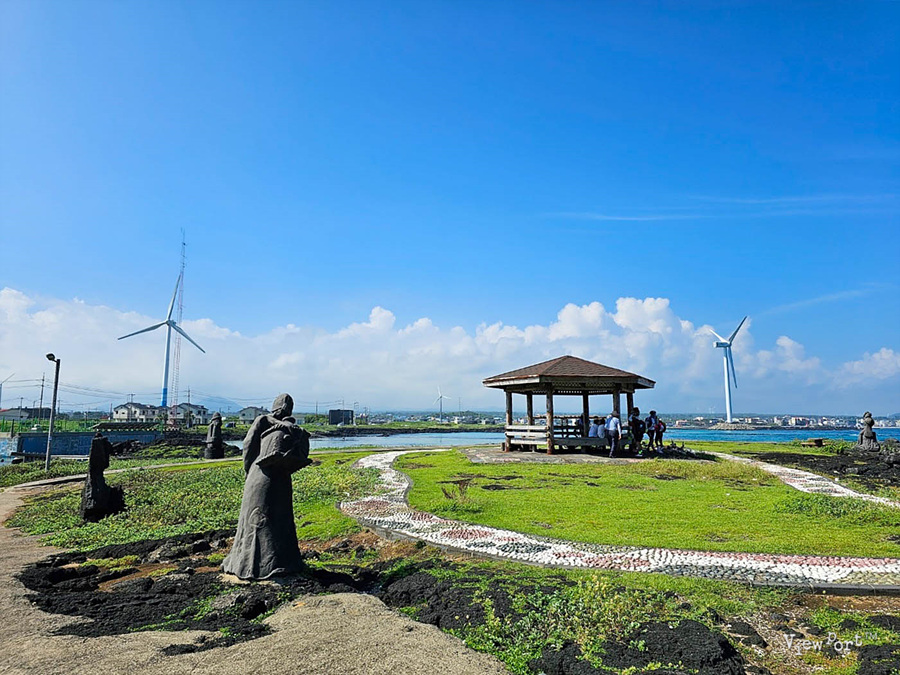 입구에 차를 대고 조금 걸어 들어가면 바다 쪽으로 정자 하나와 해녀상 그리고 돌하루방 석상들이 있습니다