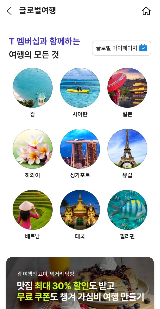 바로 SK T멤버십에 들어가보시면 글로벌여행이란 사이트가 있는데요, 여길 보시면 T멤버십으로 국내에서처럼 외국에서도 할인을 받을 수 있는 호텔, 식당등이 안내되고 있습니다