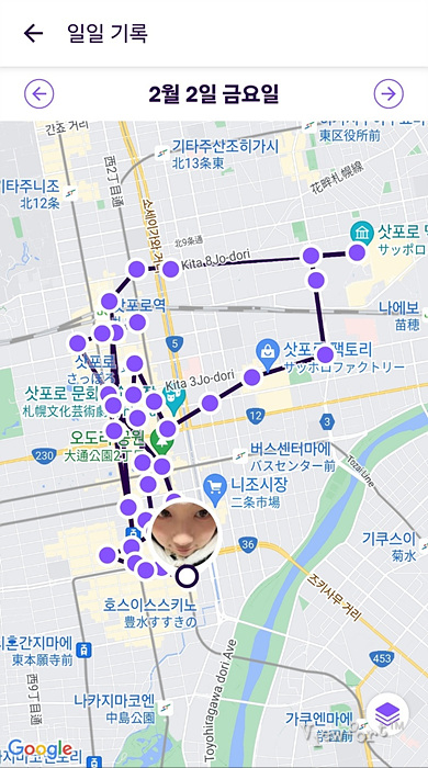 하루동안 이동 동선을 모두 볼 수 있는 기능인데요