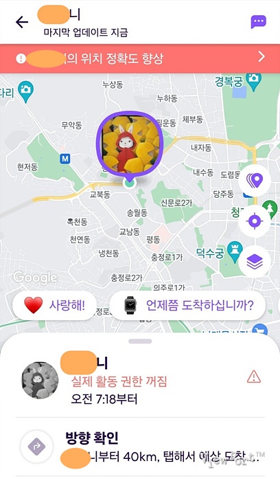 실시간으로 현재 위치와 차량으로 이동중이라면 차량 속도, 그리고 오늘 하루 이동 동선등이 모두 공유되기 때문에,
