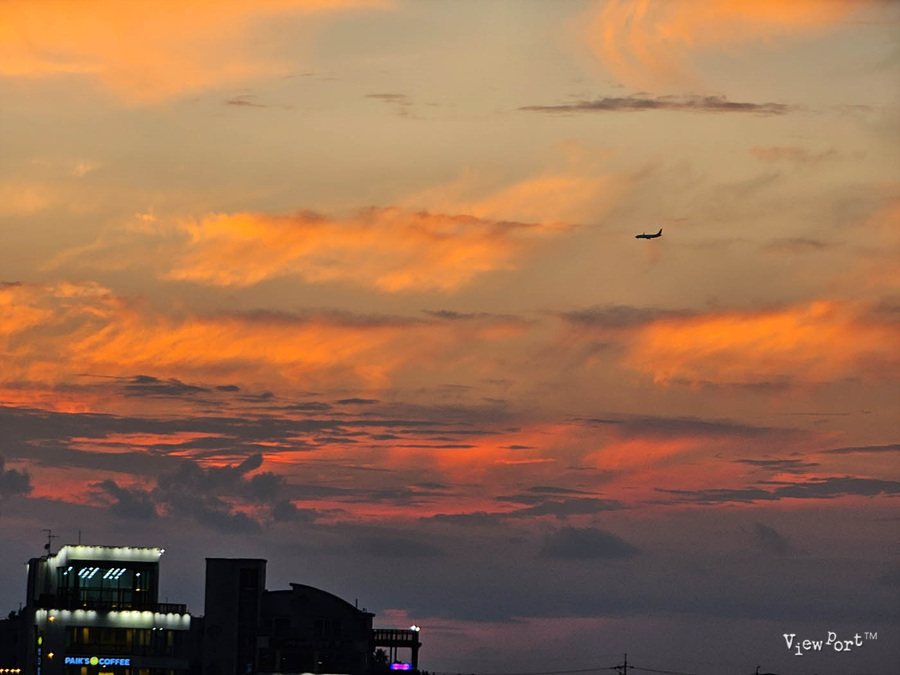 같은 시간, 해가 넘어가는 서쪽 하늘은 온통 짙고 붉게 물든 강렬한 하늘을 볼 수 있습니다