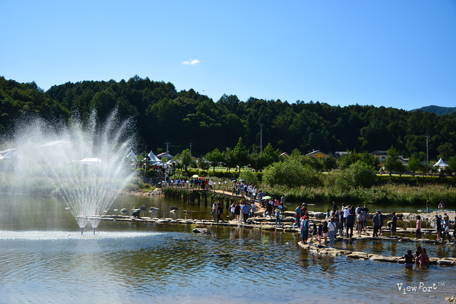 흥정계곡에서 내려오는 흥정천을 이렇게 돌다리를 이용해서 건너기도 하고, 그 옆에 있는 남안교를 건너면 평창 효석문화제 (평창 봉평 메밀꽃 축제)가 진행되는 너른 메밀꽃밭들이 보입니다.
