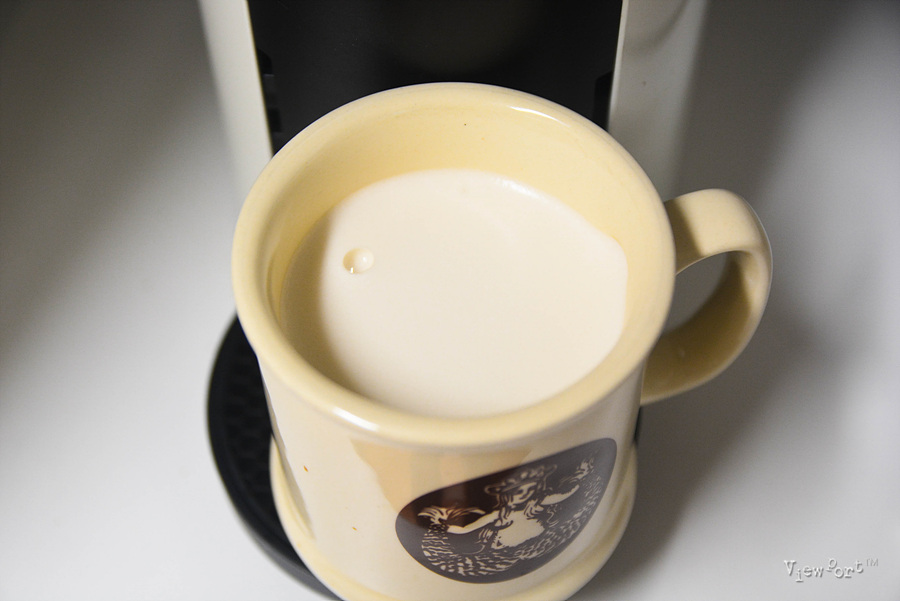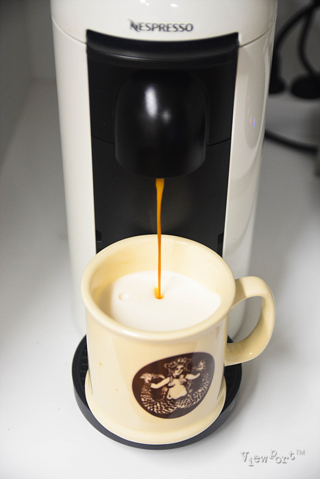윙 하는 네스프레소 기계의 소리가 나면서 구수한 커피향과 함께 커피가 추출됩니다.