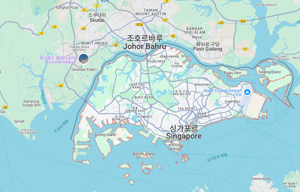 서쪽으로는 말라카 해협, 북쪽으론 조호르 해협 ,그리고 남쪽으로는 싱가포르 해협을 끼고 있어서, 해상 교통과 운송의 요충지이고 지금은 금융 선진국이기도 하죠