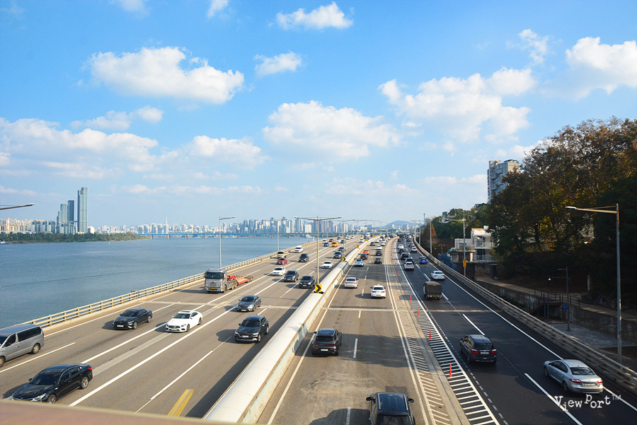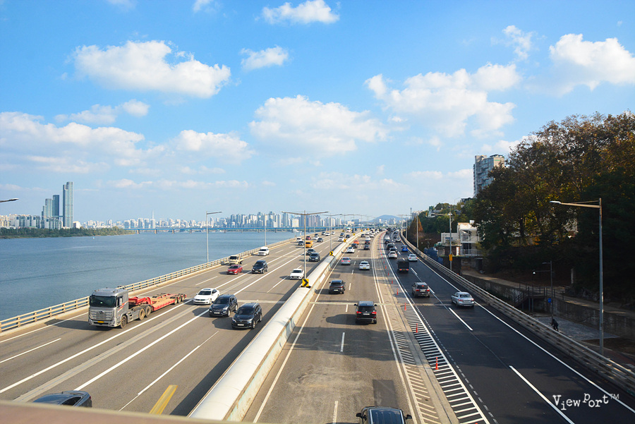 다리 구간으로 접어들면 다리 아래 올림픽대로로 달리는 차들이 보입니다.